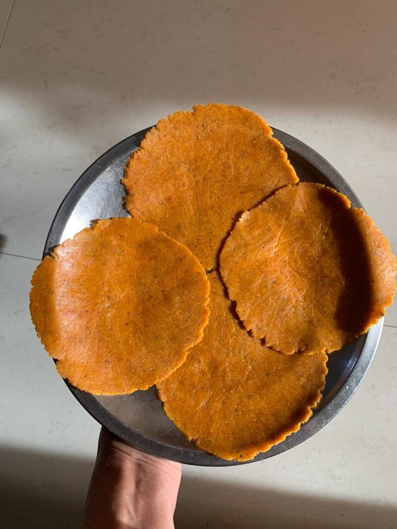 Place the rolled-out khakhras on a clean tray or cloth and allow them to dry in the sun for 1–2 hours, until they feel slightly firm and dry to the touch.