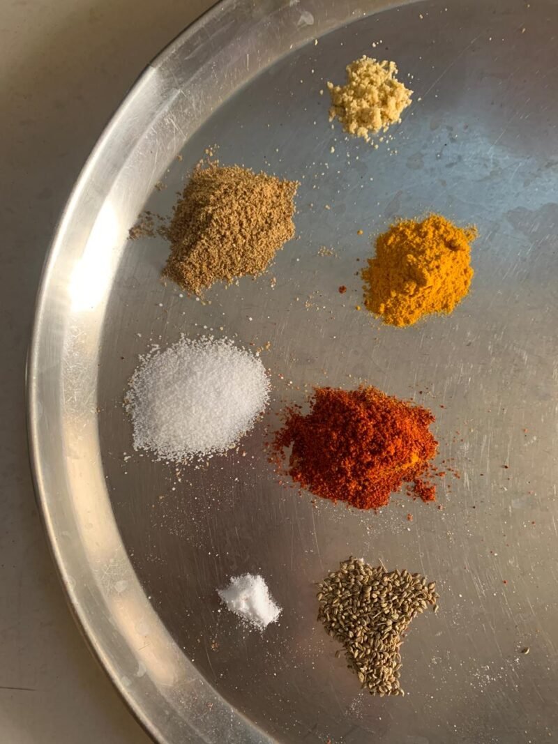 In a mixing bowl, combine the chana flour with red chilli powder, turmeric powder, coriander powder, cumin seeds, and salt.