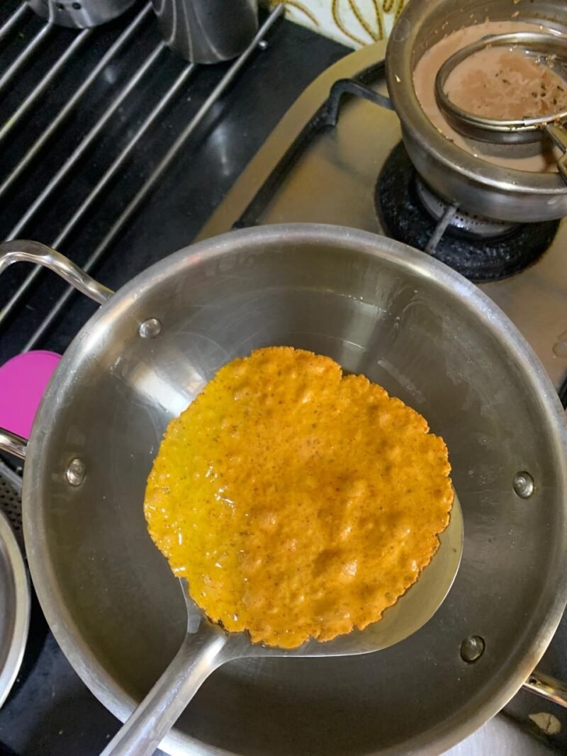 Continue flipping and pressing until the khakhra is golden brown and crisp.