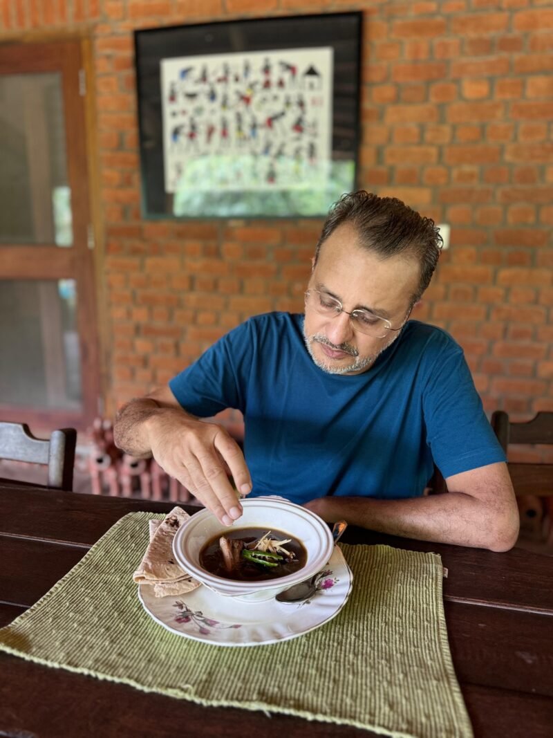 Today, Auroni has a personal library of over 200 books on food and alcohol. The paya soup is Auroni’s father’s recipe, developed slowly over the years with influences from Mughlai cooking. For both of them, drinking the soup on cold winter nights or rainy evenings with their hands wrapped around warm bowls, chewing on the bones, became a ritual that brought them back to the kitchen, and to each other, again and again. Listen to their memories of the paya soup and cooking together here.