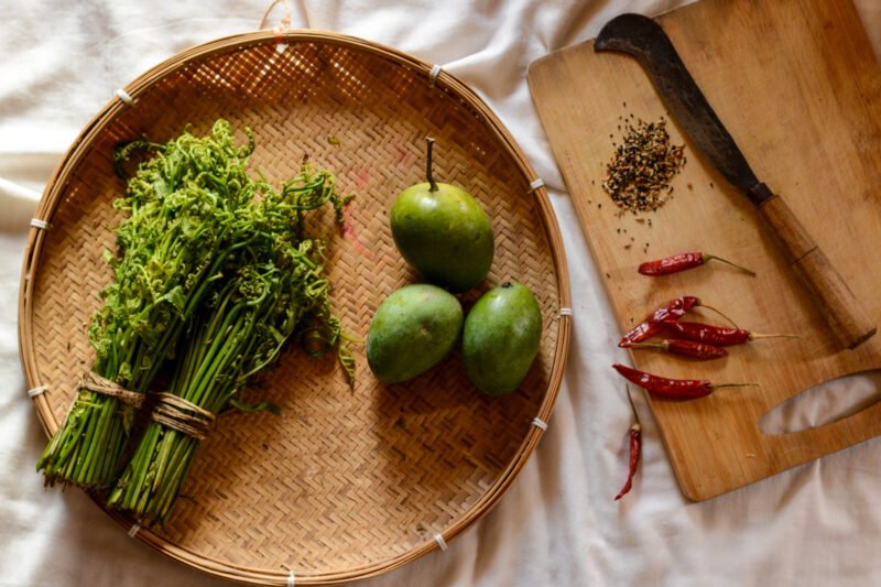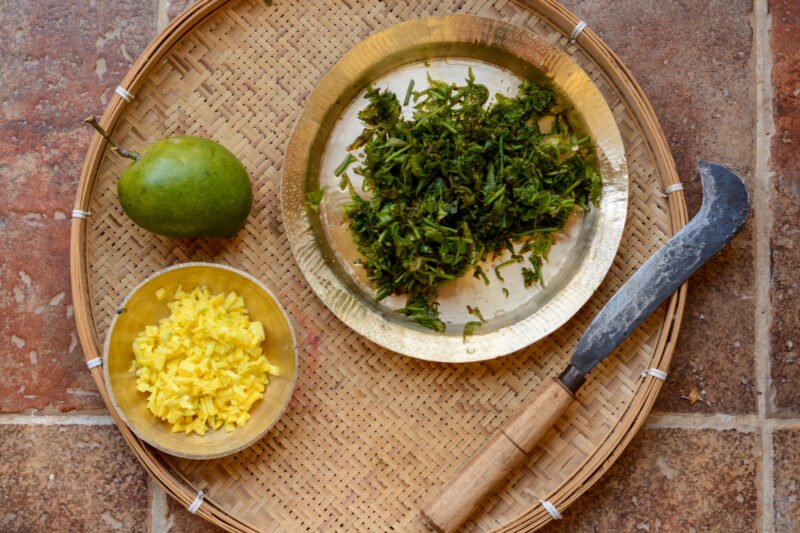 The sourness comes from raw mango, or ‘aam’ in Assamese, which balances beautifully with the earthiness of the fern. With just a handful of ingredients—dhekia, raw mango, panch phoron, and dried red chillies—the preparation is deceptively simple, yet layered and deeply satisfying.
