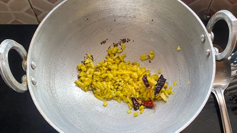 Once you finish frying the vadas, carefully remove the excess oil from the kadhai. You can strain and keep it aside for later use, but for the curry you’ll only need about 1 tablespoon of fresh mustard oil. Return the kadhai to the stove, add 1 tablespoon mustard oil, and heat it for 10–15 seconds until slightly hot.