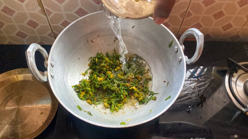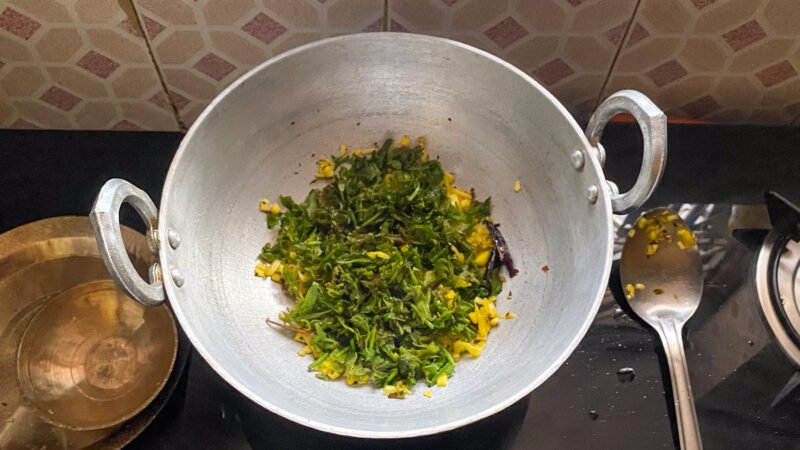 Add the chopped dhekia leaves, along with turmeric powder and salt. Stir well so the spices coat the leaves. Cook for about 3 minutes until the leaves shrink and release some water.