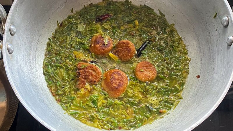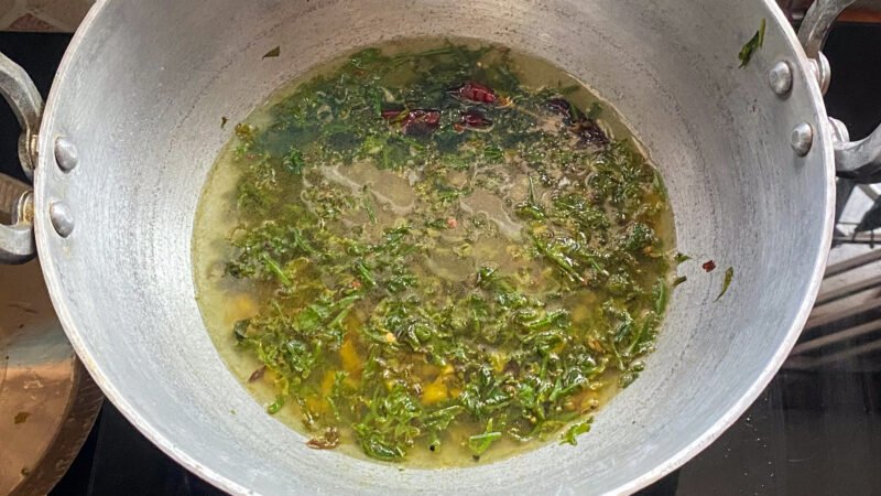After 5 minutes, uncover and taste the curry. Adjust salt if needed. The flavour should be slightly tangy from the mango and earthy from the dhekia.