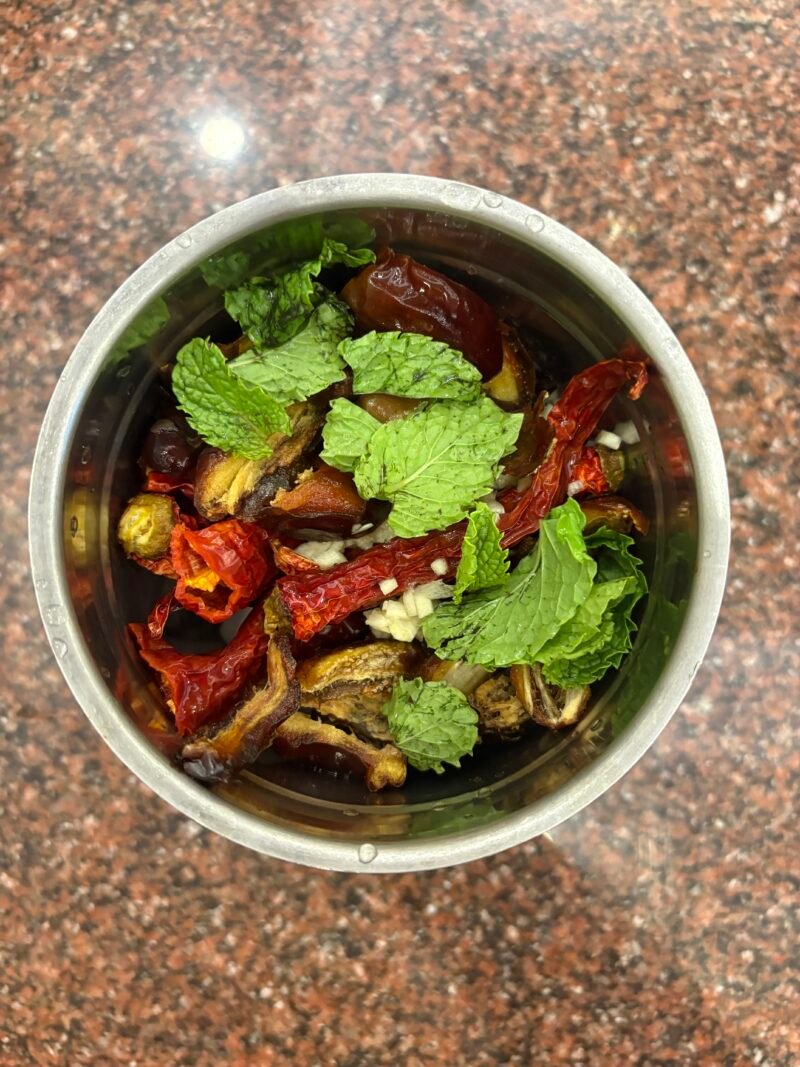 To make the masala paste, first soak the dried red chillies in warm water for about 10-15 minutes, until they soften and become pliable. Drain them and place them into a mixer-grinder along with the peppercorns, chopped onions, deseeded dates, cloves, cinnamon stick, tamarind pulp (or vinegar), cumin seeds, garlic cloves, and mint leaves. Add 2-3 tablespoons of water and grind until you have a smooth, thick, deep reddish-brown paste.