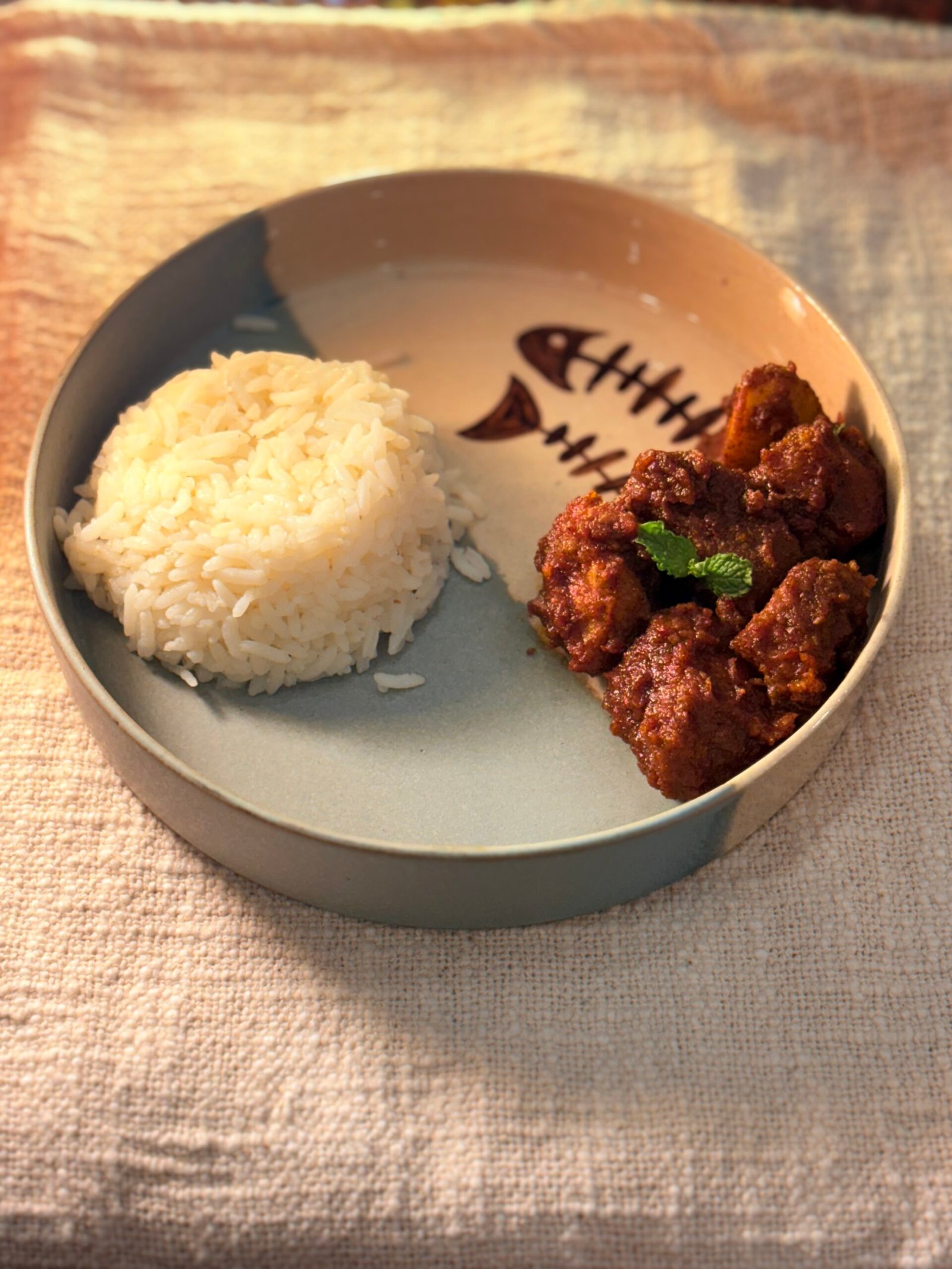 Pork Indad is best served warm, alongside plain rice or soft pav to mop up the gravy.