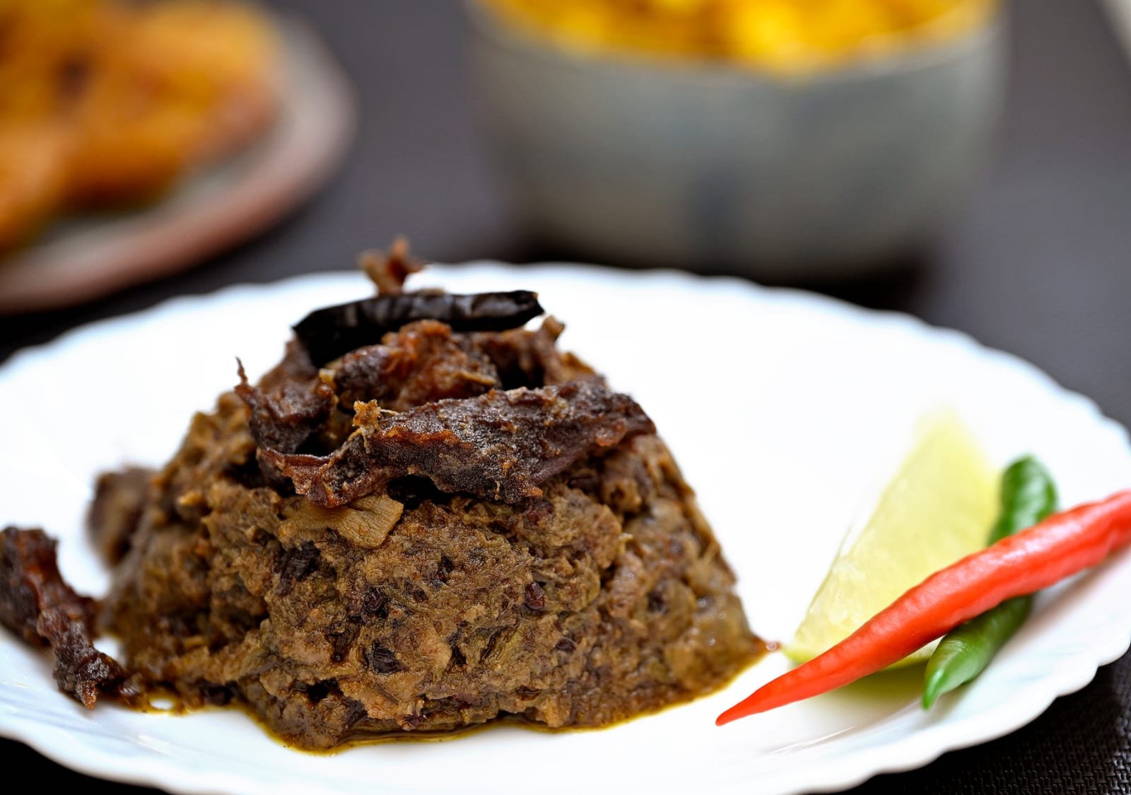 The dish is prepared in both vegetarian and non-vegetarian forms across Bengal. In this version, dried beef is paired with the vegetable and cooked with a light tempering, allowing the flavours of the shaak and meat to shine through in equal measure.