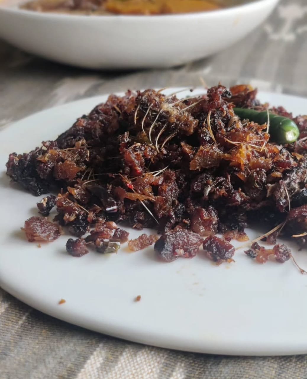 Moumita first encountered Ghaittya about 15 years ago, soon after her marriage. Having grown up in Bengal, her experience with Hilsa was mostly through classic preparations like Ilish Bhaja and Ilish Bhapa. In contrast, she found Chittagong’s food to be distinct, marked by new flavours, the generous use of garlic, and a fondness for dried fish. It was her cousin sister-in-law Himani, a native of Chittagong, who introduced her to Ghaittya.