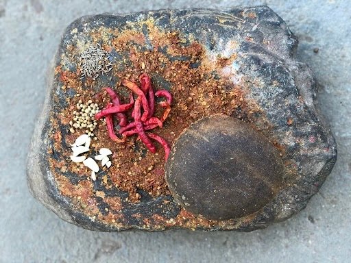 Vatelo Masalo is a fiery and flavourful hand-pounded masala paste. In many of the homes Sheetal visited, it was prepared fresh every morning in a stone mortar, and then used throughout the day, infusing each meal with its bright flavours and nourishing goodness. The ingredients—which vary by season—are pounded rhythmically with salt until a fragrant, homogenous paste is formed.