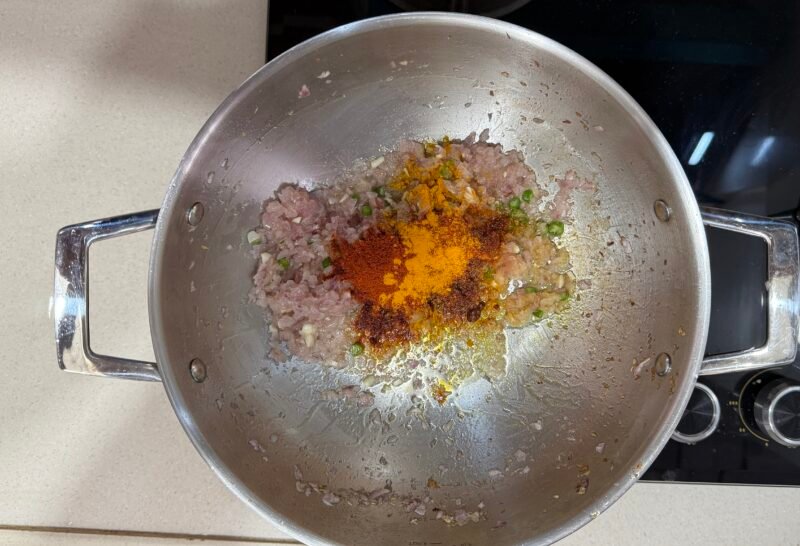 Add the turmeric powder and Koli Masala powder. Sauté for 1 minute, stirring continuously so the spices do not burn.