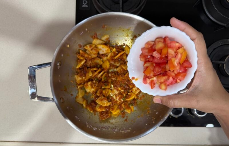 Add the sliced potatoes and fry for 2 minutes. Then add the chopped tomato and cook for 5 minutes on medium heat. Stir often to ensure the tomato softens and the spices stay evenly mixed.
