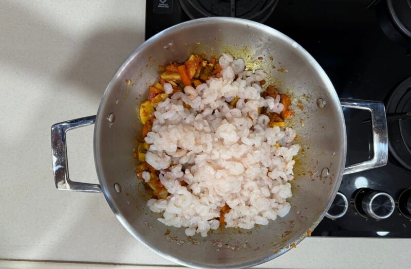 Add the shrimp to the pan and mix gently so everything is coated in the masala. Pour in the water and bring to a gentle simmer.