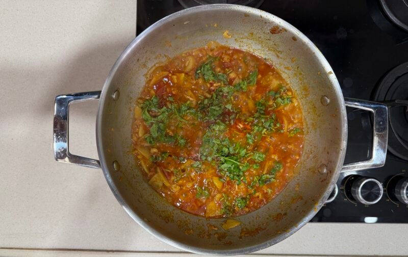 Garnish with chopped coriander leaves. Serve hot with rice bhakri or steamed rice.