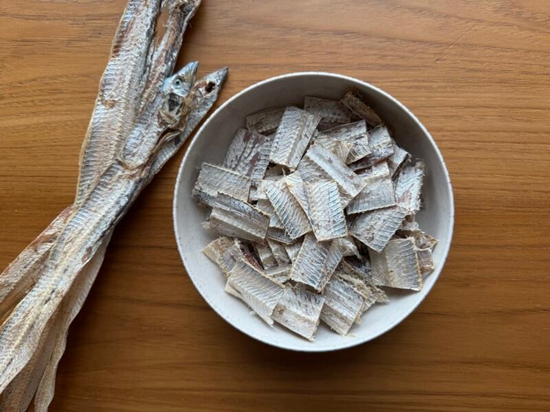 Begin by cutting the dried ribbon fish into small pieces. Place them under running water and rinse thoroughly to remove any surface salt or impurities. Transfer the rinsed fish pieces to a bowl of medium-warm water and allow them to soak for 5–6 minutes. After soaking, discard the water and rinse the fish once more under running water. Set aside.