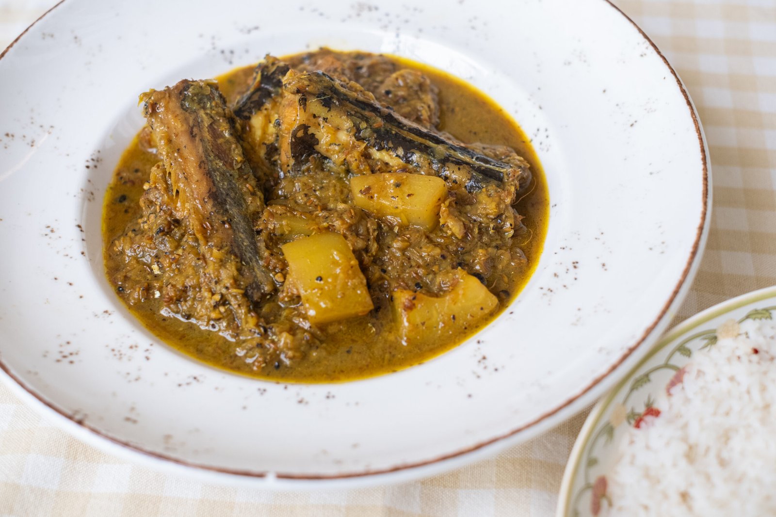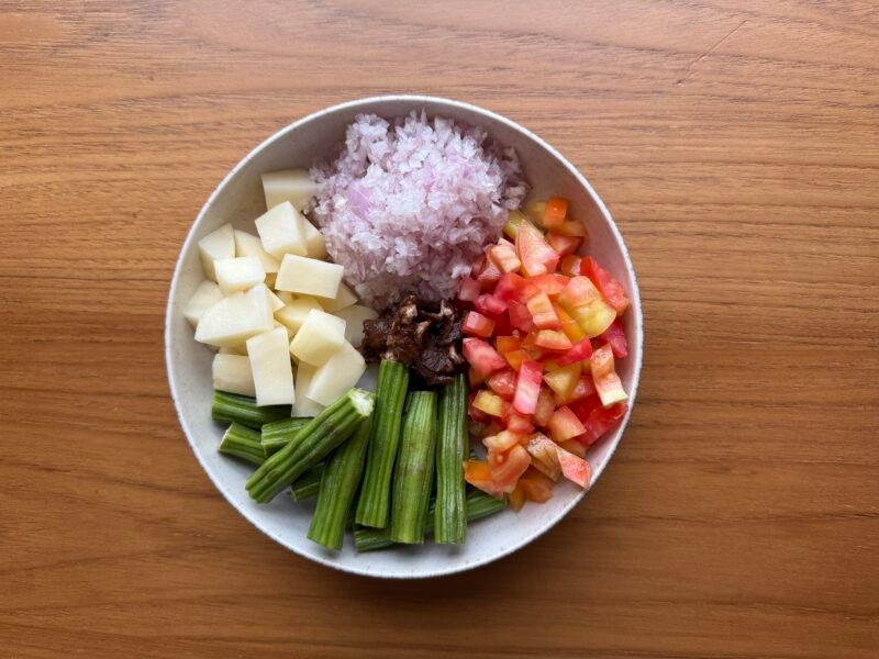 Ribbon fish, as the name suggests, has a long, slender, silver-coloured body and is known by various names across coastal India—’Vakti’ in Marathi, ‘Chhuri Mach’ in Bengali, and ‘Vaala Meen’ in Malayalam, among others. Like much of the excess seafood catch, it is washed, salted, and dried along the coastline for use during periods when fishing is restricted. This family recipe, Ukar, shared by Bhavesh Koli, comprises dried vakti along with drumsticks and potatoes. True to Koli cooking, this comforting preparation also features Koli masala, which lends the dish its characteristic flavour.