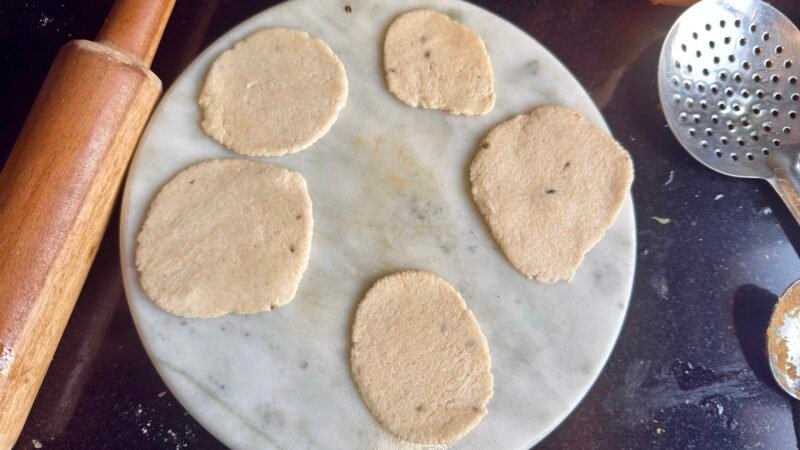 Divide the rested dough into 12–14 small balls. Oil the rolling board, rolling pin, and dough balls lightly. Roll each ball into a small poori, slightly thicker than gol gappa, ensuring the edges are not too thin.