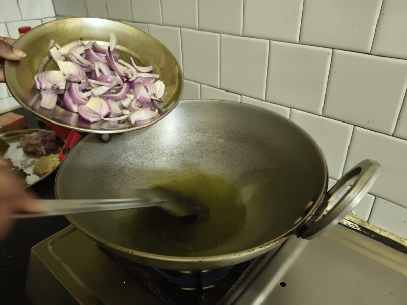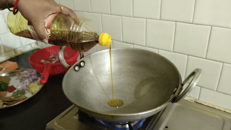 Place a heavy-bottomed kadhai on medium heat. Add the mustard oil and let it heat until it just begins to smoke lightly.