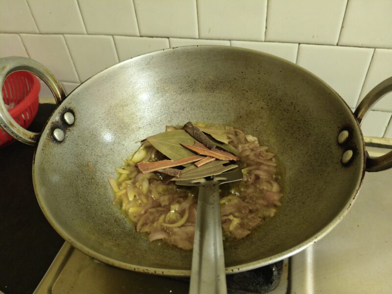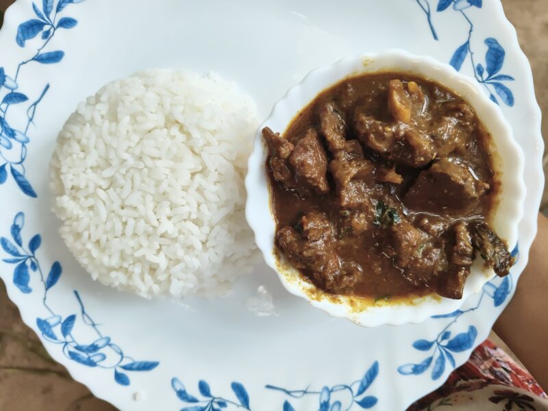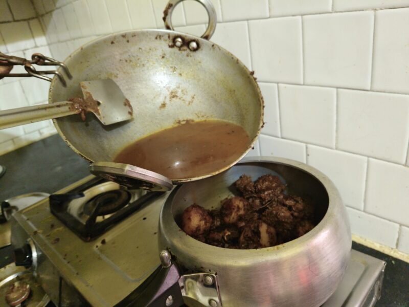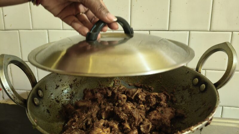 While Jinnie and Rini would often help their mother in the kitchen, they did not get the chance to cook their mother’s iconic dish with her. Years later, Jinnie recreated her mother’s recipe with her mami, Purnamani Majhi, with help from other family members. The mutton was cooked in a large iron kadhai for hours, until it was fall-off-the-bone tender, the gravy thick and brown.