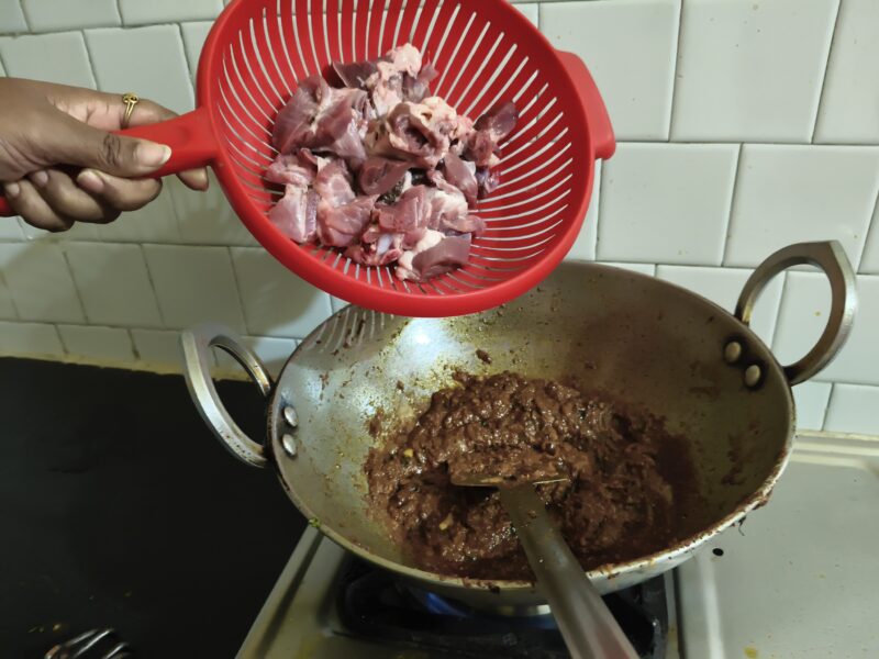 Add the washed mutton pieces and mix thoroughly so they are well coated in the kasa masala.