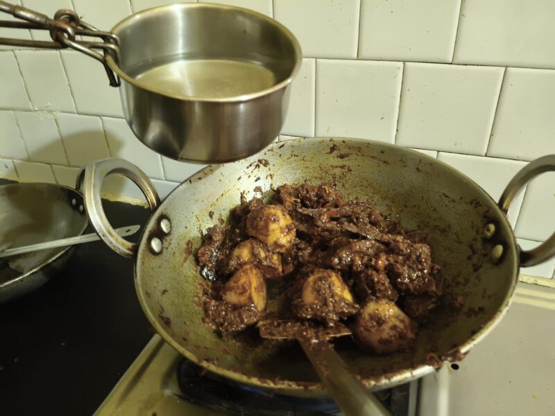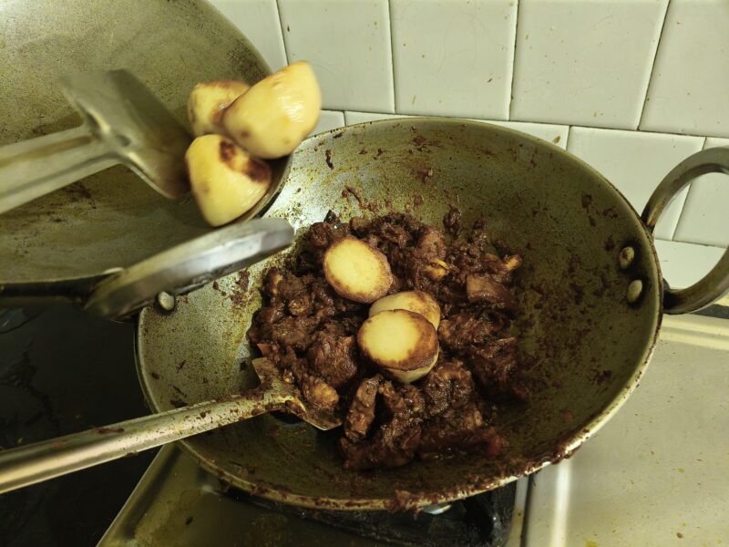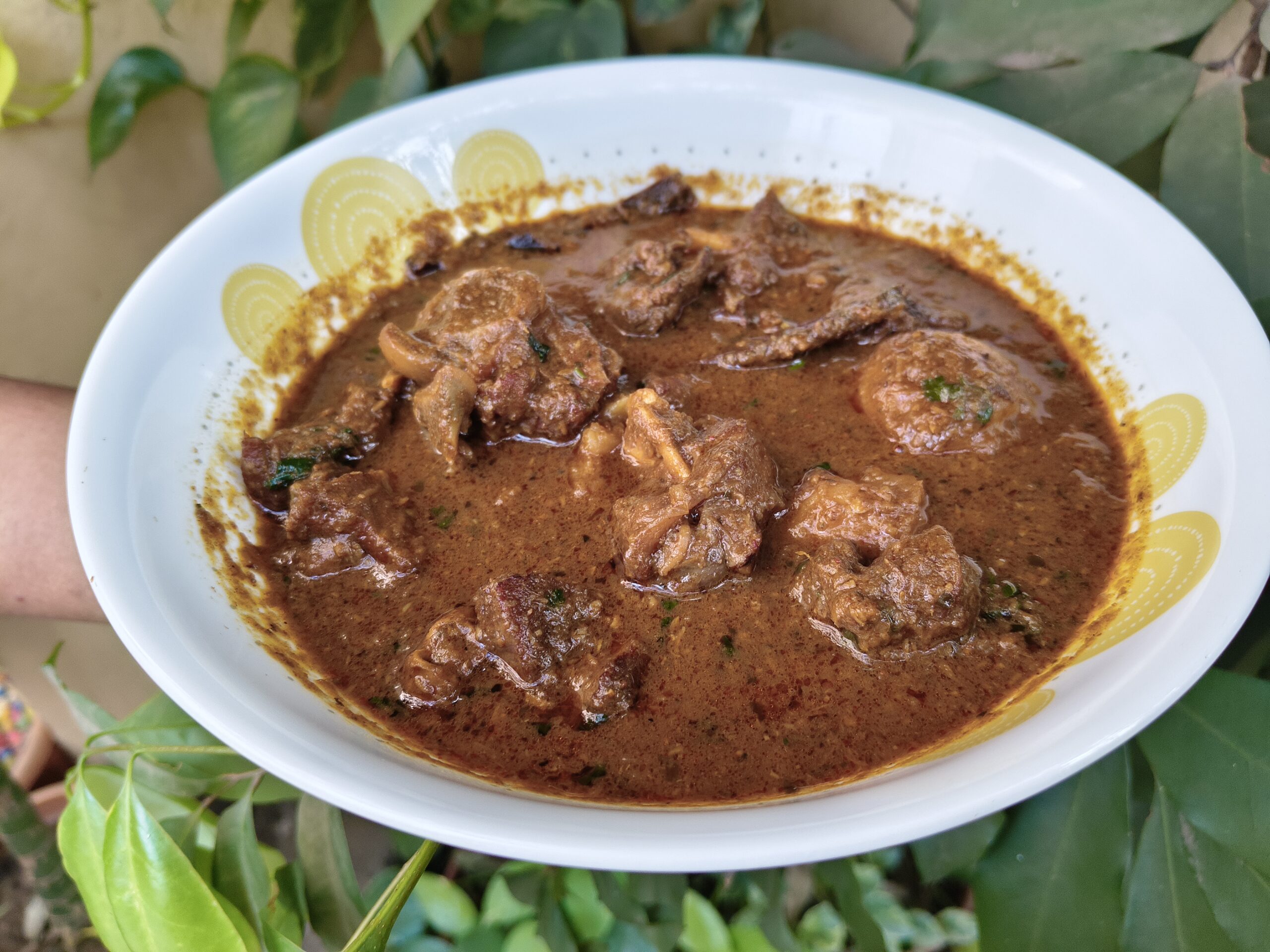 Check the seasoning and consistency. The gravy should be thick and brown, and the mutton tender.
