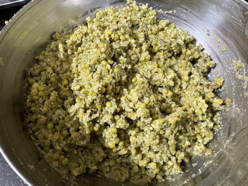 Add the drained ponkh and salt to the moong mixture in the bowl. Mix well until everything is evenly combined. The mixture should be thick enough to hold its shape when spooned.