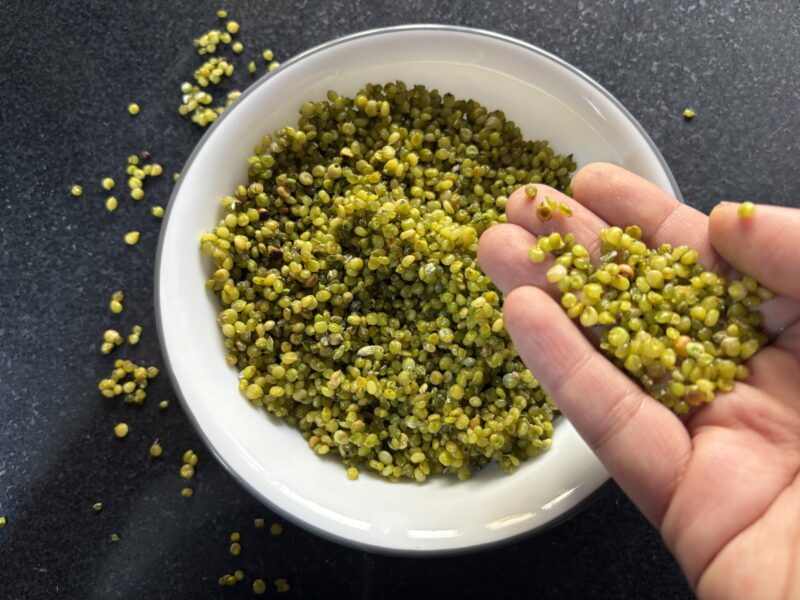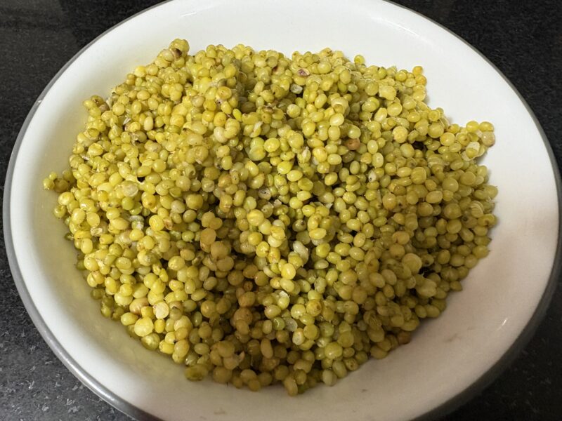 Bring a pot of water to the boil. Once the water is bubbling, add the fresh ponkh. Let it boil for about 1 minute. This helps remove any impurities and will slightly soften the grains. Drain the ponkh through a sieve and allow any excess water to drain away fully.